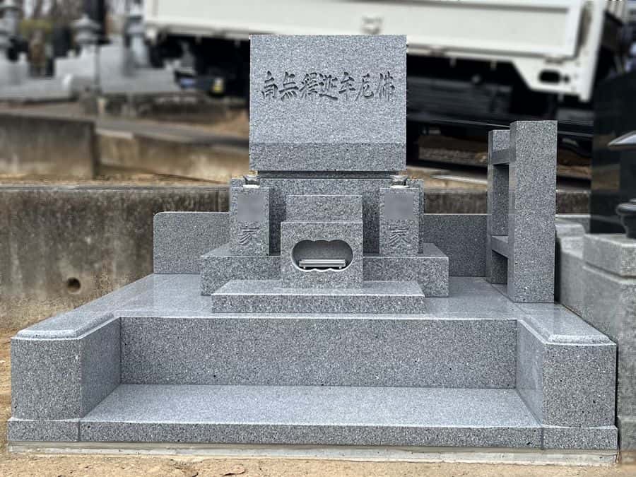 お施主様のご要望は掃除が簡単で、結婚された娘夫婦(苗字が異なる)たちと一緒に入れるようなお墓を建立したいとのことでした。通常は玉砂利仕上げが多い中、石張り施工をしました。これで雑草などの草取りがへり掃除が簡単になりました。天台宗の寺院のため「南無阿弥陀仏」としました。これでみんな一緒にお墓に入ることが可能となりました。シンプルに仕上げました。